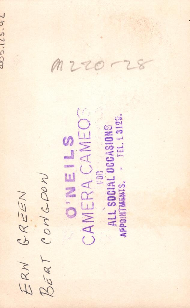 Reverse: Written in black pen is 'ERN GREEN' and 'BERT CONGDON'. There is a purple stamp, 'O'NEILS CAMERA CAMEOS FOR ALL SOCIAL OCCASIONS. APPOINTMENTS - TEL. L 3129.'