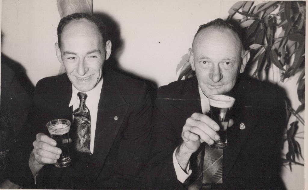 c. 1930Image: A photograph of Ern Green (left) and Bert Congdon (right) sitting next to eachother. They are both wearing dark coloured suits, with patterned ties, and a pin on the lapel. They are both holding what appears to be a glass of beer. Behind them on the right is a eucalyptus plant.