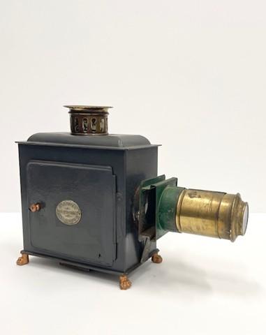 A children’s toy magic lantern projector, designed for domestic use, used miniature glass slides and was illuminated by a candle, paraffin, or similar burner.
