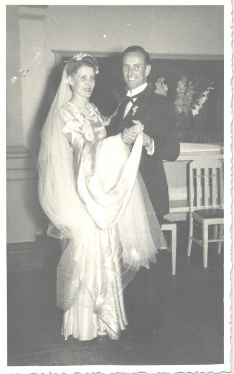 B/W Prints. (a) Thelma and Dudley Barton cutting bottom tier of two tier cake decorated with a miniature bride. The table is covered by the bridal party's bouquets and there is a decorative candlestick on the right. (b) Dudley and Thelma, with veil and train caught over her arm, in the bridal waltz. Chairs and an arrangement of gladioli are in the background.