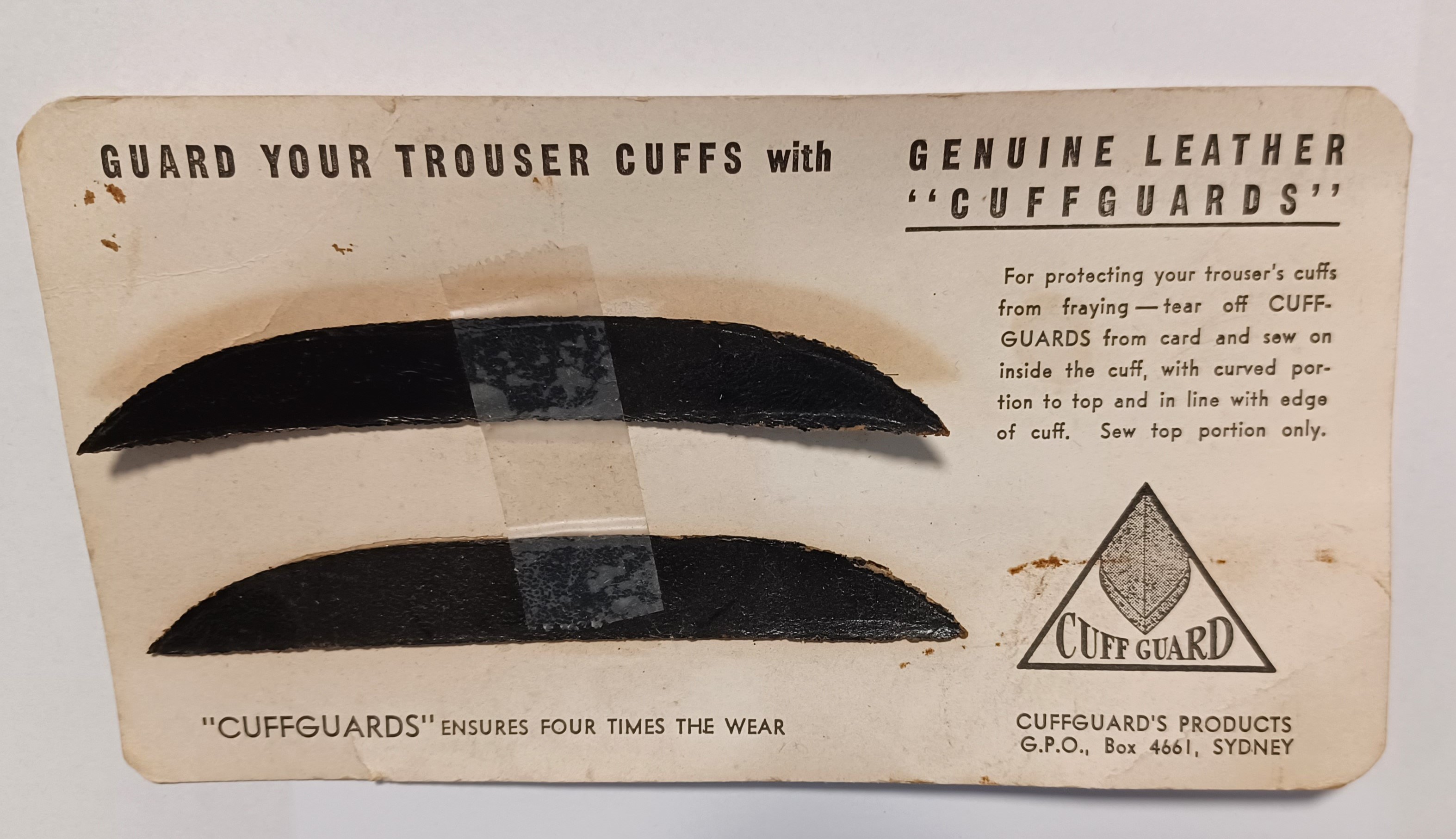 For protecting your trouser's cuffs from fraying - tear off cuffguards from card and sew on inside the cuff, with curved portion to top and in line with edge of cuff. Sew top portion only."