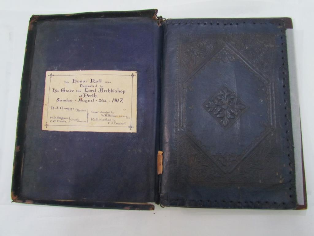 An inscription inside reads 'This Honour Roll was dedicated by His Grace the Lord Archbishop of Perth, Sunday August 26th 1917. R.J. Craggs, Rector; W.O. Gregson and C.W. Mudie, Church Wardens; cover donated by W.H. Henderson; roll inscribed by F.J. Crockett'. There is a second cover of embossed navy leather, with a coat of arms on the back. Inside are 24 parchment pages, all with gold paint surround making ornate crosses in each corner. The frontispiece reads: 'St Andrews, Subiaco, Western Australia Roll of Honour - in memory of those members of the Church who volunteered for God King and Country in the Great War 1914-1919. Rev. R .J. Craggs, Rector. W.O. Gregson, C.W. Mudie, Church Wardens'.