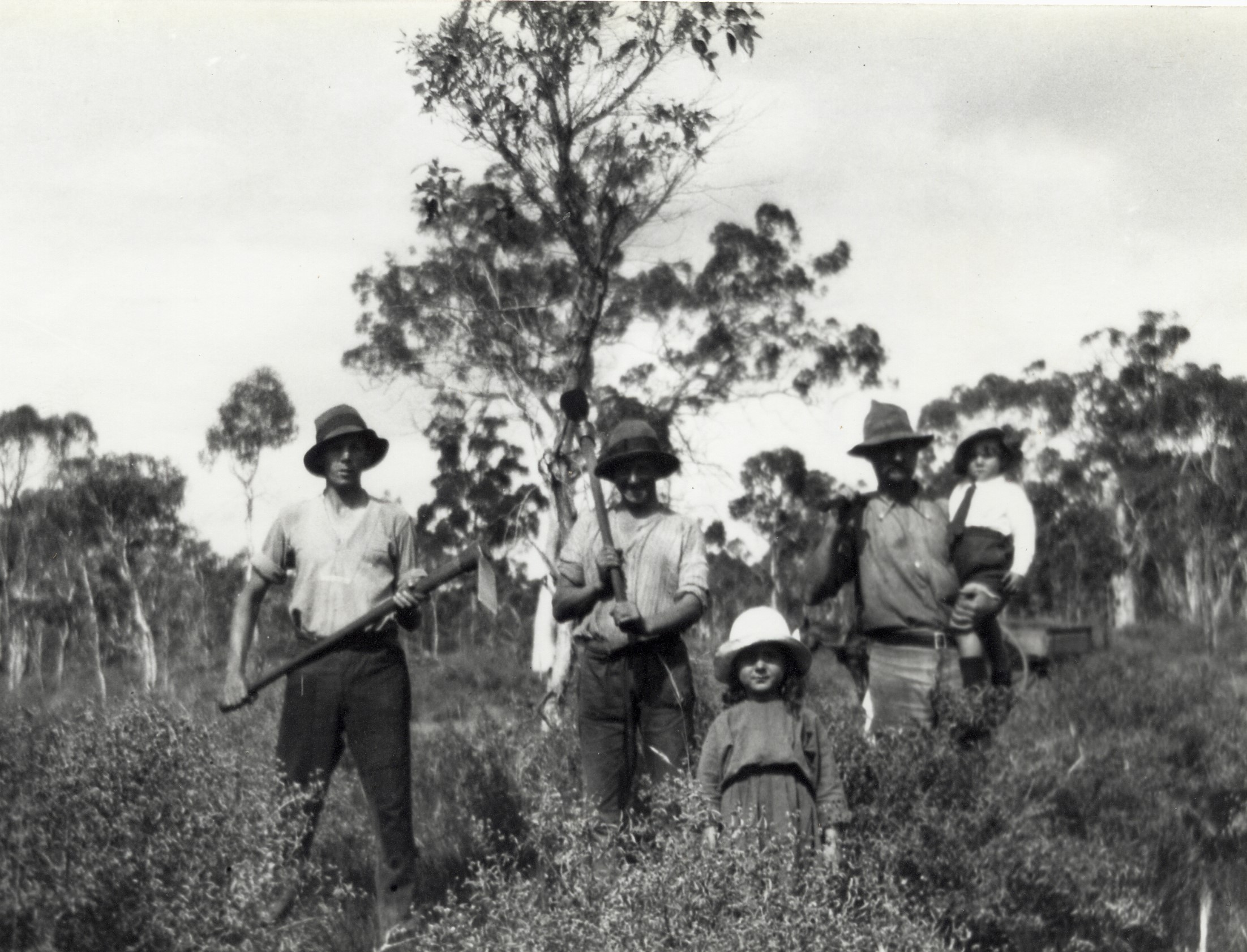 1923Ted Nifton, Alan Reid, Dosh Gaunt, Syd Gaunt with Henry Gaunt. Approx 1923. Sucker Bashing. ie digging out poison plants. THIS IS AN EXTREMELY RARE PHOTO OF CLEARING AWAY POISON PLANTS.