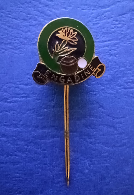 metal round badge with enamel frontage of a lawn bowl and white ball ('jack') and gold text lettering