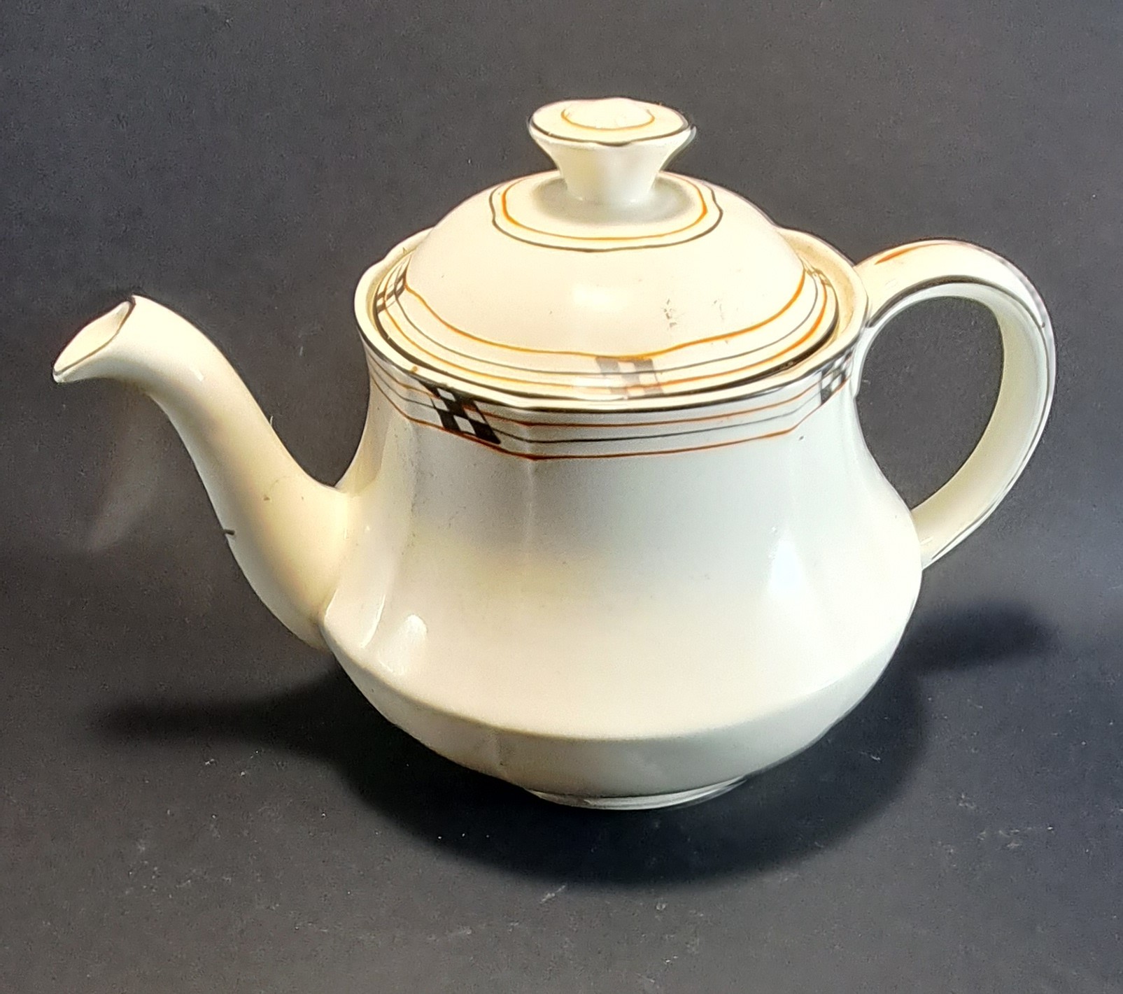 cream ceramic tea pot, with lid. has gold colored lines of grey and red, around top of pot and edge of lid with small grey squares