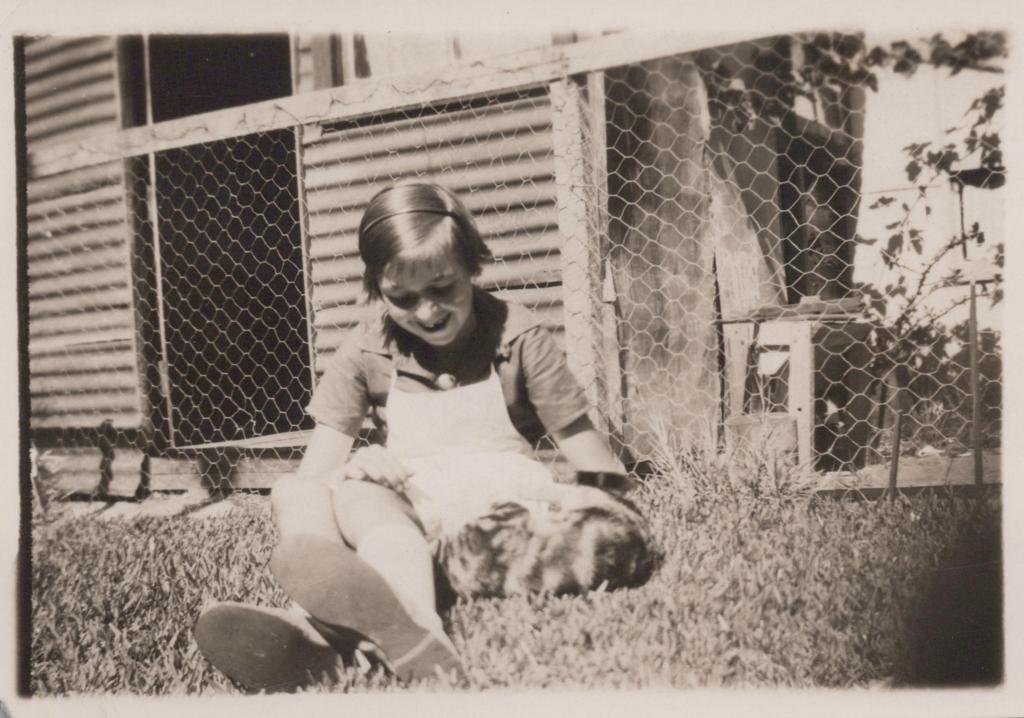 c. 1930Image: A black and white photograph of Thelma Congdon as a young girl, sitting on grass in front of a wooden fence. She appears to be wearing a short sleeved button down shirt, white apron, and closed shoes with long white socks. Behind her is a wooden wire fence and part of a wooden building.