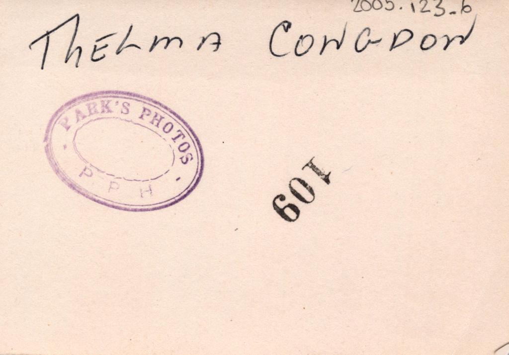 Reverse: Handwritten in black pen ' THELMA CONGDON'. Stamped on the back with a purple oval stamp reading 'PARK'S PHOTO PERTH' and a number '109' in black.