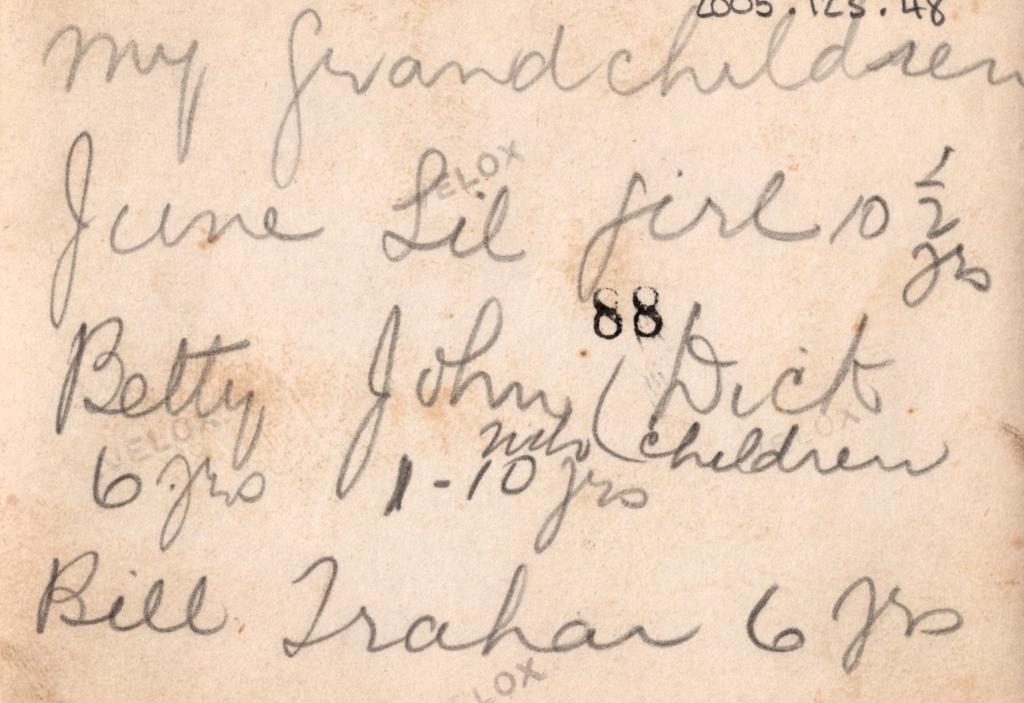 Reverse: Written in pencil is 'my grandchildren', 'June Lil girl 10 1/2 yrs', 'Betty 6yrs', 'John (Dick) 10yrs', and 'Bill Graham 6 yrs'. There is a black number stamped, '88'.