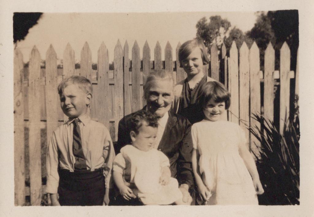 c. 1930Image: A photograph of what appears to be Bessie Congdon seated on a chair, surrounded by four children. There is a young boy to the left, wearing a white dress shirt and a tie, tucked into black pants. The younger child on Bessie's lap is wearing a light coloured dress, as is the small girl on the right. The older girl on the right is wearing a dark coloured top. Bessie is wearing a white button-down top, with a dark coat over it. Behind the group is a wooden picket fence.