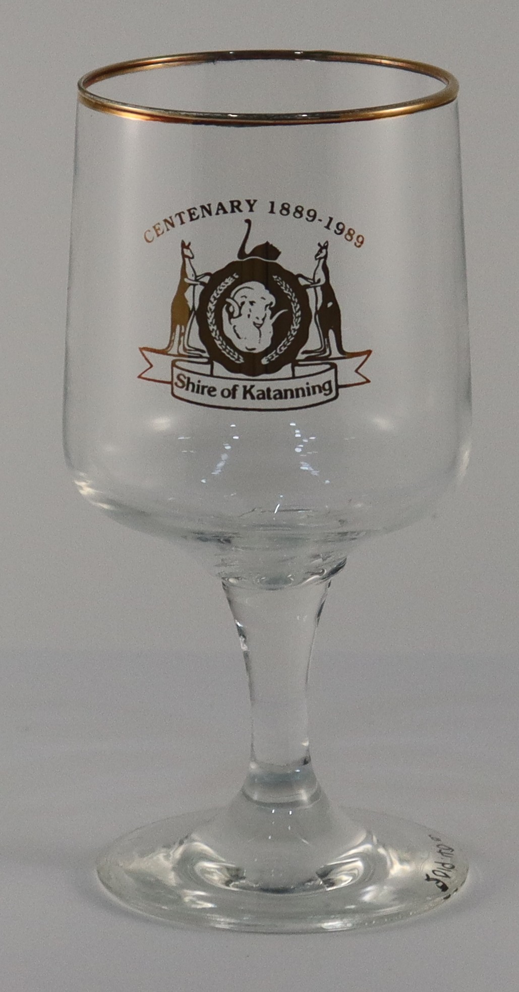 1989A short stem round base glass which has gold lettering around the rim. On the glass is the a gold circle which has a fluted edge, in the centre is a etched ram's head and on either side is etched stalks of grain. Above the circle is a black swan and either side of the circle are standing kangaroos. This logo is the "Katanning Shire Crest"