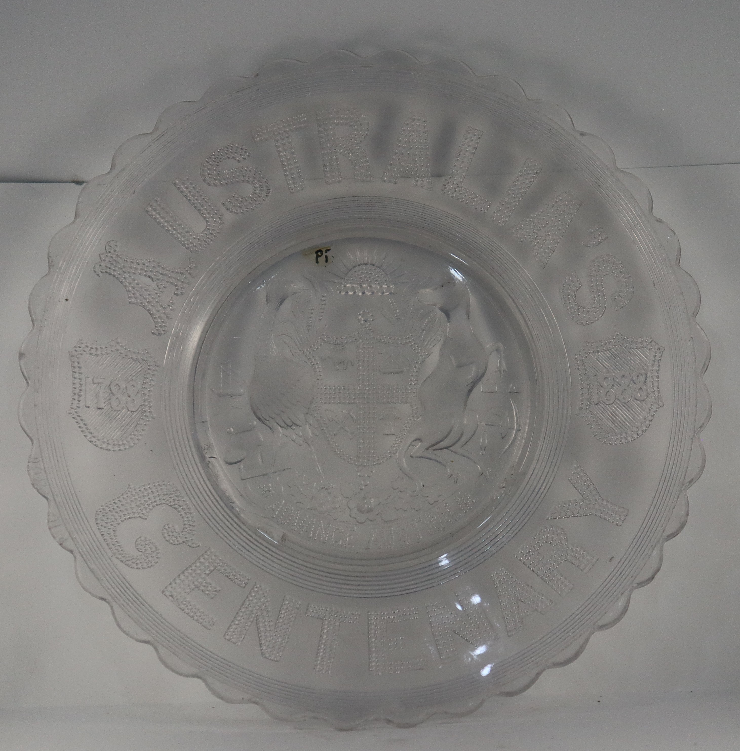 Around the edge of the plate at the top reads "AUSTRALI'AS" and at the bottom is "CENTENARY". On the left hand side of the rim in a shield is "1788" and on the right hand side in a shield is "1888".