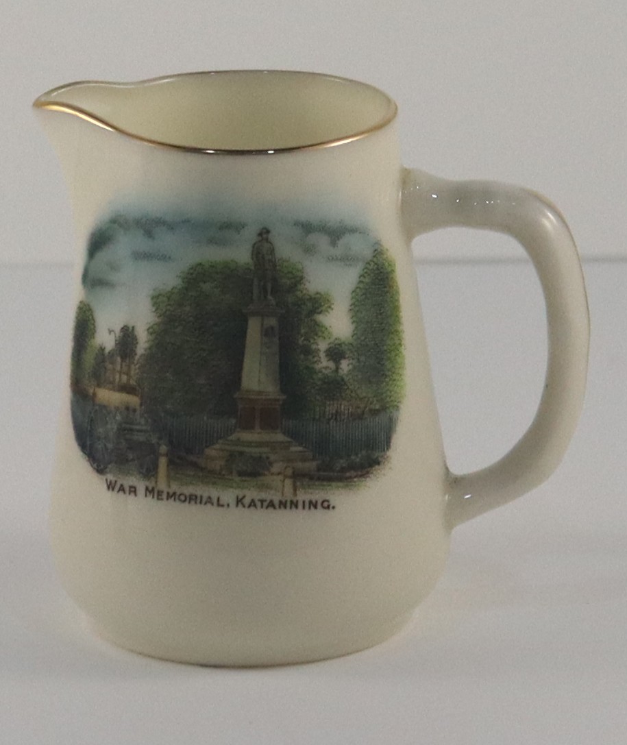 1920A small cream coloured jug with a coloured picture of the Katanning War Memorial and on the left of the memorial is a cannon. The rim of the jug ha a gold trim, and there is a gold trim down the centre of the handle.