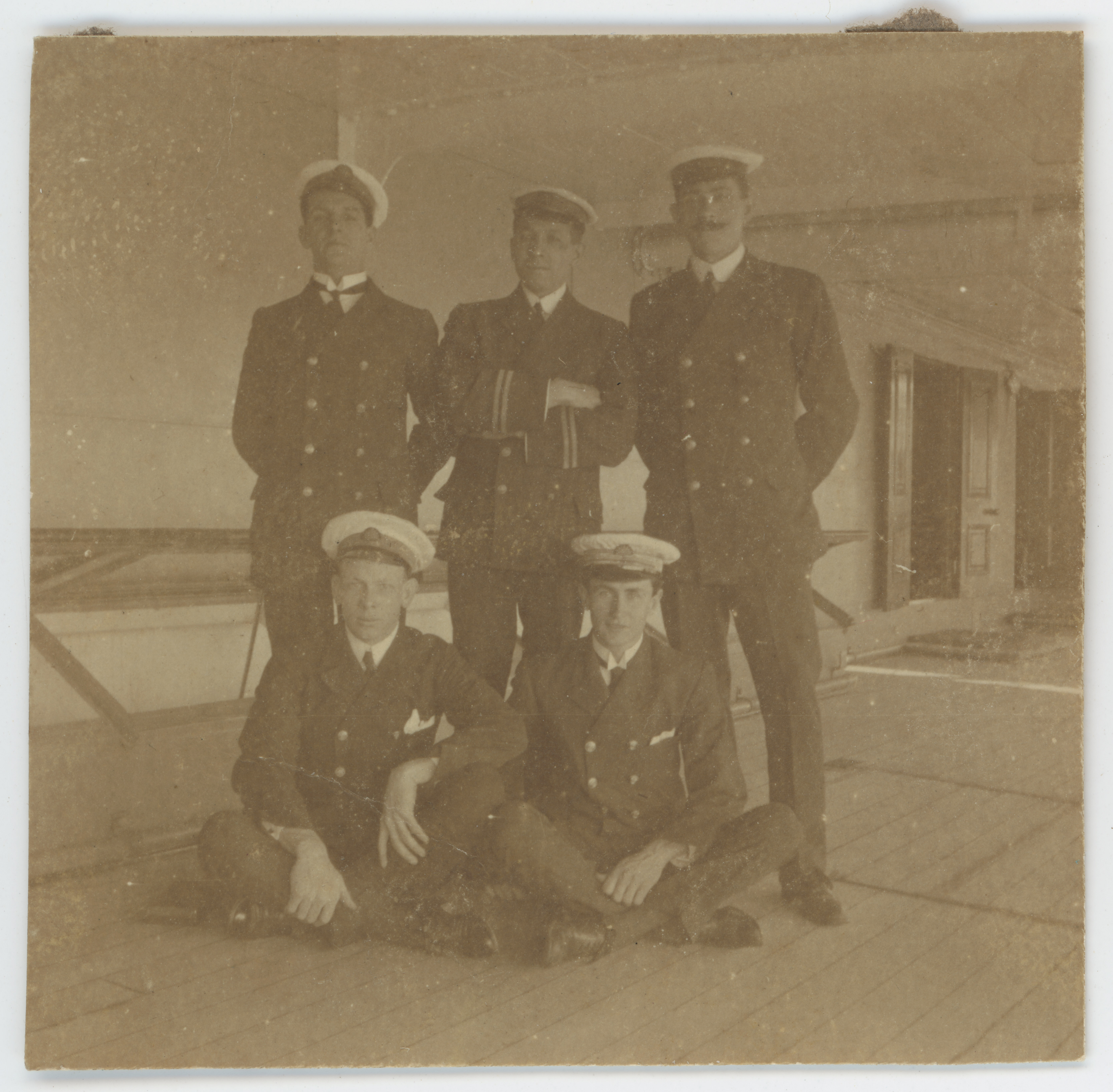 Photograph taken on the deck of SS Pera. (see similar photograph 2025.2.14, which includes inscription on the rear). Photograph has remnants of brown paper where it has been glued onto a page.