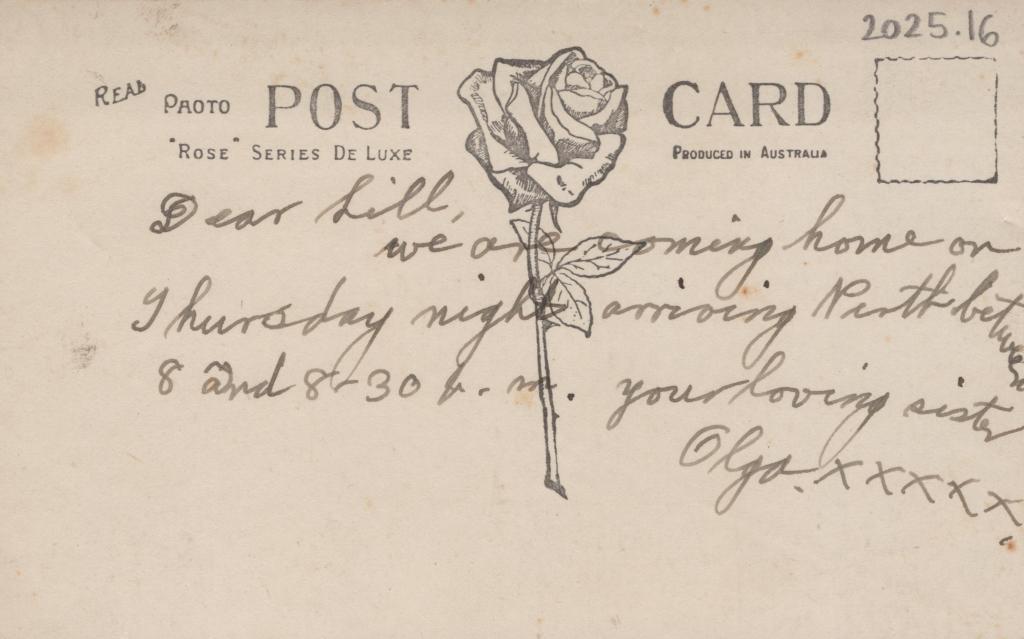 The reverse has a print of a rose in the centre with the words 'POST' and 'CARD' either side of the bud. A handwritten message reads 'Dear Lill, / We are coming home on / Thursday night arriving Perth between / 8 and 8-30p.m. Your loving sister / Olga xxxxx'