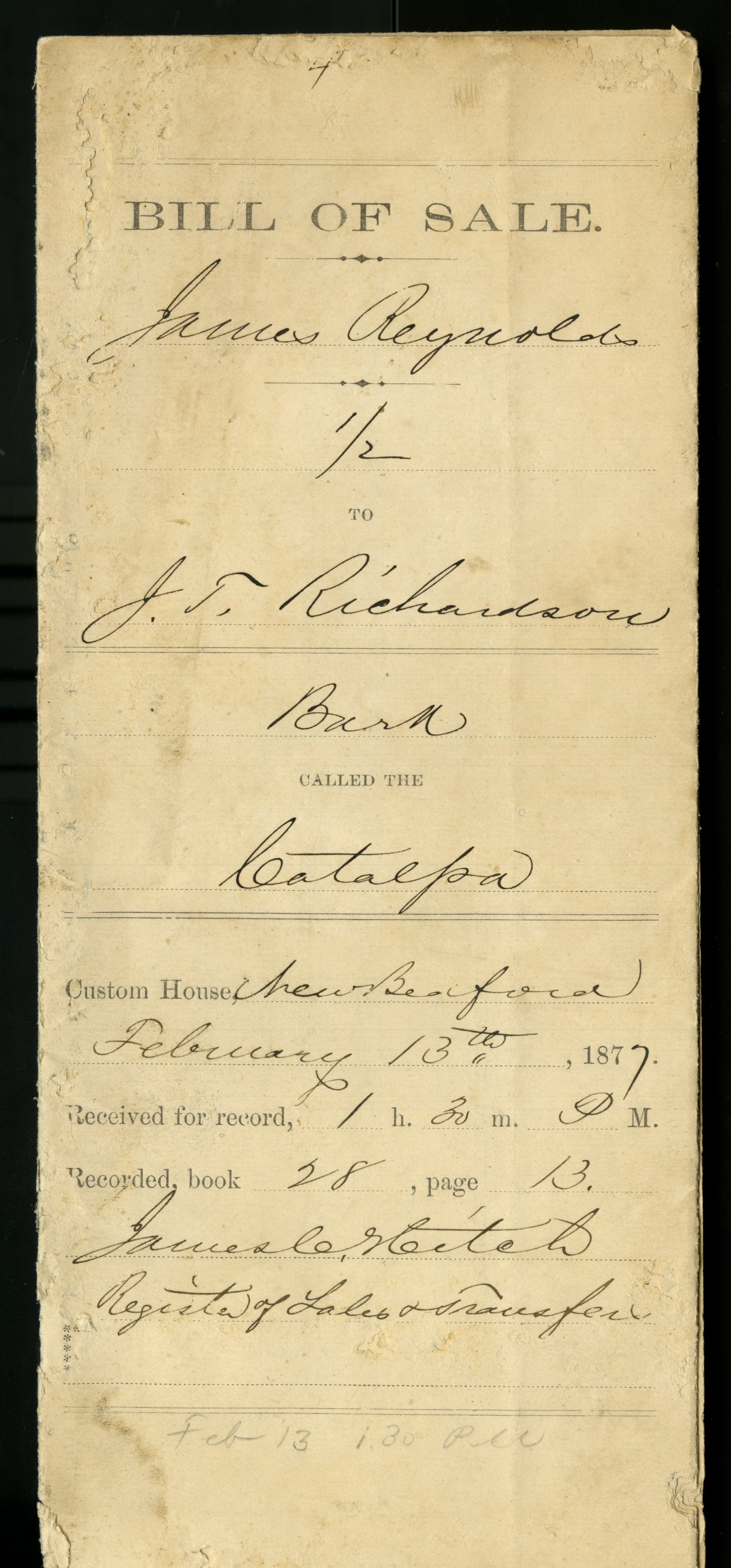'BILL OF SALE/ James Reynolds/ 1/2 /TO /J. T. Richardson/ Bark/ CALLED THE/ Catalpa/ Custom House New Bedford/ February 13TH 1879./ Received for record, 1h. 30m. PM/ Recorded book 28, page 13./ James [...]/ Register of Sales & Transfers'