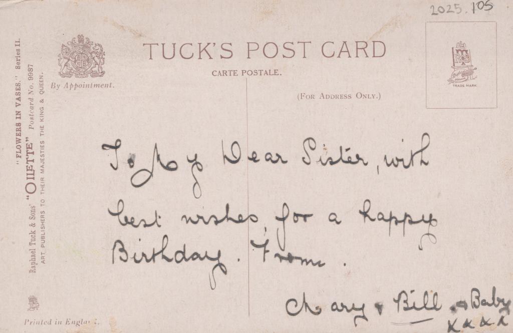 A cursive message in black ink reads: 'To My Dear Sister, with / best wishes for a happy / Birthday From / Mary & Bill & Baby / xxxx'
