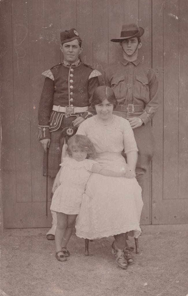 c. 1913Postcard showing four people including two men in uniform, one female and one young child.