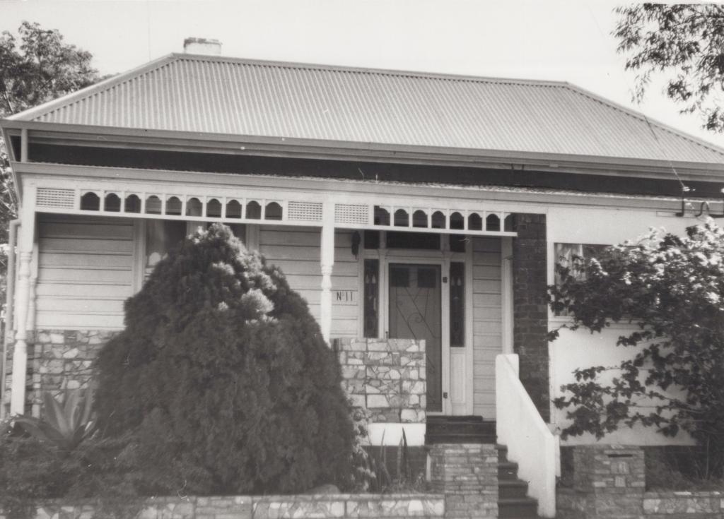 1985Black and white photograph of a house at 11 Smyth Road. The house is made of wood and bricks. There is a verandah supported by decorated wooden beams. There is a wooden decorative framework attached beneath the roof of the verandah. The roof of the verandah is above the main entrance and a window to the left. There is a stone wall in front of the house. There is a large bush partially covering the stone wall and the left part of the house. There is a staircase leading up to the main entrance of the house. There is another lower stone wall with an opening to the stair case on the ground in front of the house. The number '11' is seen to the right of the opening. There is a large bush covering some of the right part of the house. There is a large tree in the background in the top left corner.