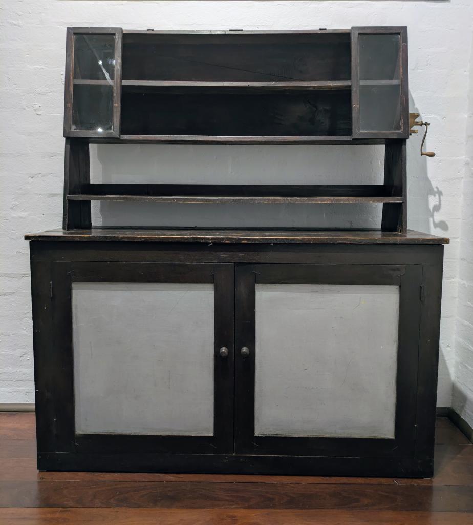 1933Kitchen Dresser: Dark brown painted wooden dresser. The cupboard part (lower half) has a wooden frame and two doors with painted tin windows inserted. Inside are two shelves placed on a narrow wooden board; width is adjustable (hessian cloth). It has a flat upper surface, made out of three wooden boards placed next to one another. Above this is a case with three shelves. The upper two are narrower than the lower one and have a wooden backing and narrow wooden framed glass doors (that can be lifted) at left and right sides. The shelves are lined with newspaper which was commonly used and replaced by oil cloth as more money became available. The dresser was designed and made by a 12 year old boy in 1933 for his family.