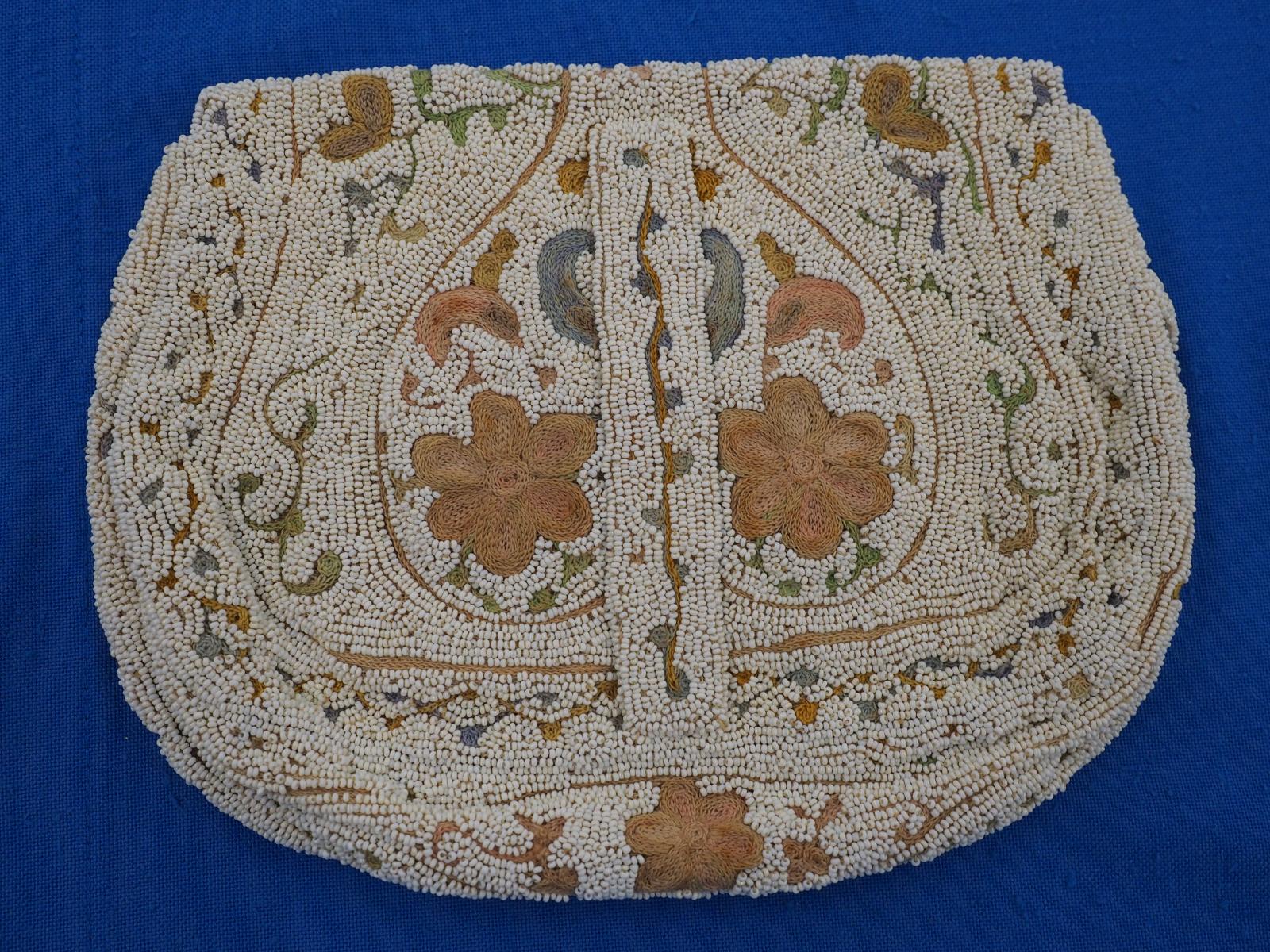 The rounded shape has floral design in tan cotton tambour embroidery, surrounded by hand stitched tiny white glass seed beads. Flap opening which has a press stud. Beaded strap at back of bag to go over a lady’s wrist.