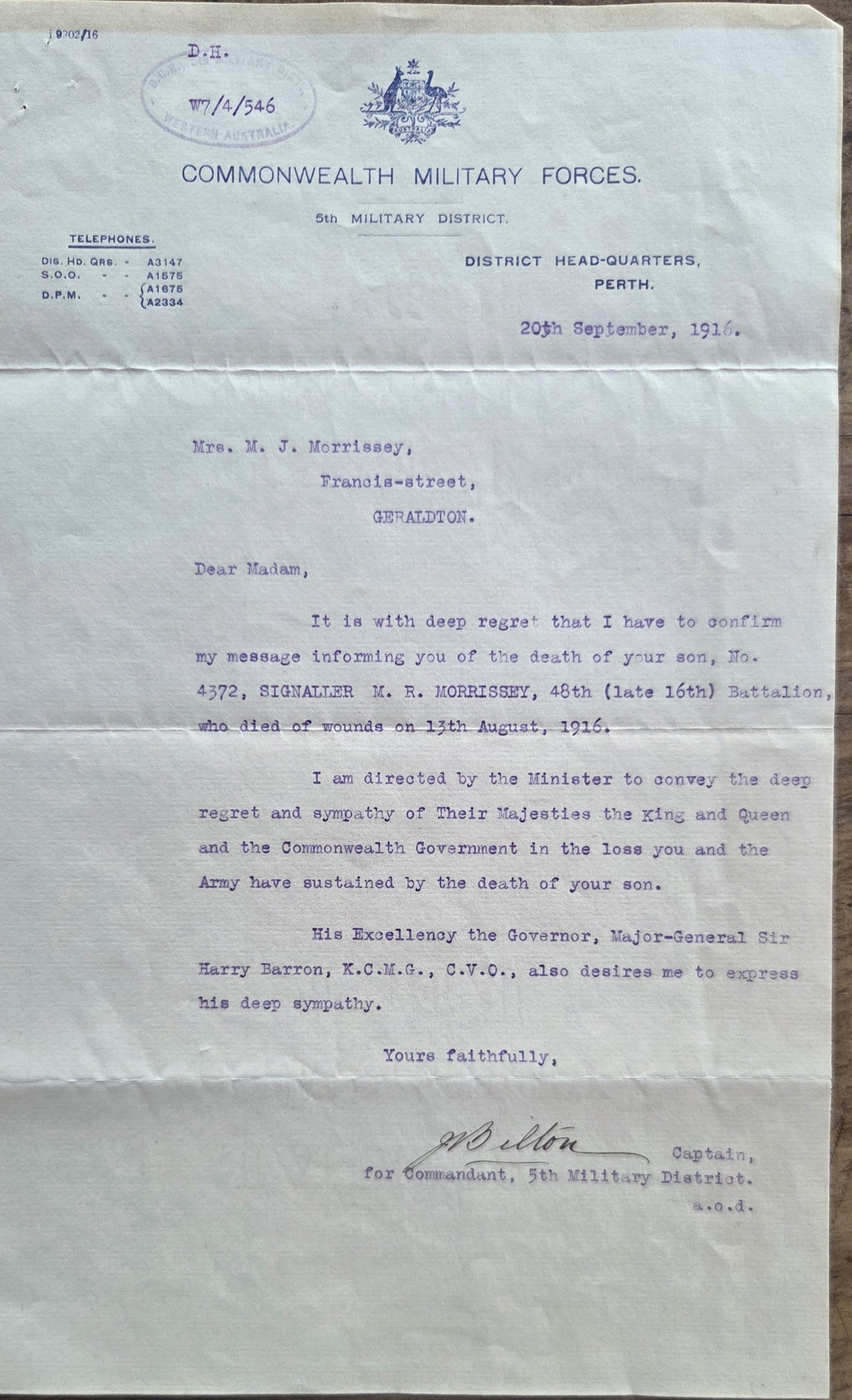 D.H. W7/4/546 Commonwealth Military Forces 5th Military District, District Head-Quarters, Perth. 20th September, 1916.