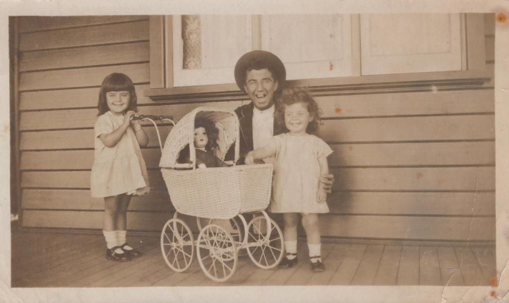 c. 1910Image: A photograph of Dorothy, Pete and Hallman Trenberth, standing with eachother on a wooden deck. They stand infront of a wooden clad building, and a window. Dorothy and Pete both wear a short, light coloured dress, with white socks and black enclosed shoes. Hallman wears a white shirt underneath a dark coloured jacket, and a hat. Dorothy pushes a small pram, with a doll inside.