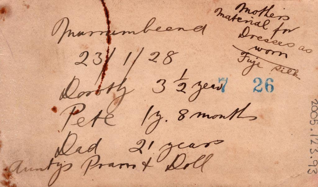Reverse: Written in black pen, '23/1/1928', 'Dorothy 3 1/2 years', 'Pete 1yr 8 months', 'Dad 21 years', 'Auntys Pram + Doll'.