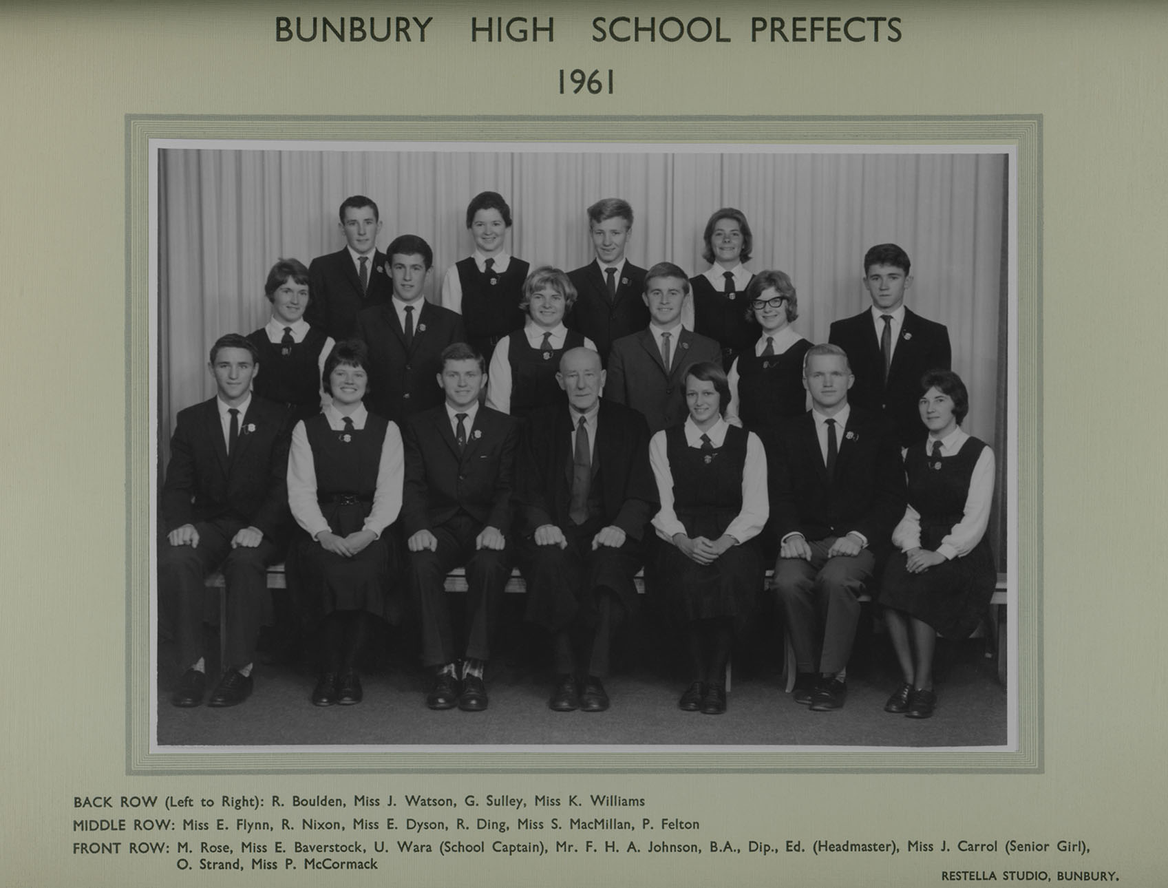 1961Studio portrait of the 1961 Bunbury High School Prefects with headmaster Frederick Johnson.