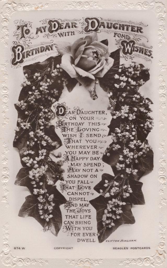 1915Vertical cream poscard with grayscale image of a rose with a wreath of leaves and smaller flowers. 'TO MY DEAR DAUGHTER / WITH FOND / BIRTHDAY WISHES' along the top edge in bold font which is surrounded by decorative swirls. In the middle of the 'wreath' is more smaller text which reads: ' DEAR DAUGHTER, / ON YOUR / BIRTHDAY THIS / THE LOVING / WISH I SEND, / THAT YOU / WHEREVER / YOU MAY BE / A HAPPY DAY / MAY SPEND / MAY NOT A / SHADOW ON / YOU FALL / THAT LOVE / CANNOT DISPEL, / AND MAY / THE JOYS / THAT LIFE / CAN BRING / WITH YOU / FOR EVER / DWELL'. The artwork is signed in the bottom right by 'CLIFTON BIGNHAM'. Below this, along the short bottom edge, reads: ' 874W COPYRIGHT BEAGLES POSTCARDS'.