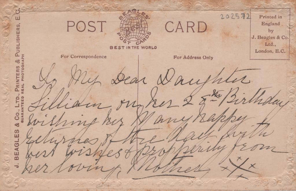 The reverse has a handwritten cursive message in black ink which reads: 'To My Dear Daughter / Lillian on her 28th Birthday / Wishiner her Many happy / ?? Of the day with / best wishes & prosperity from / her loving mother' There is an X at the end with four smaller X-es surrounding it.