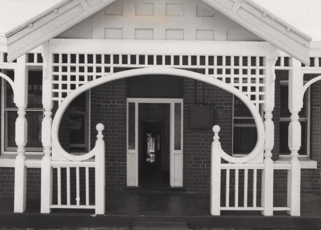 1985Black and white photograph of a house at 16 Barker Road. The house is made of bricks and partially painted white. The house has a gable roof. The top part of the roof is not included in the image. The gable is supported by decorated wooden beams and a wooden latticework. The main entrance is in the centre of the image, behind the wooden beams and latticework.
