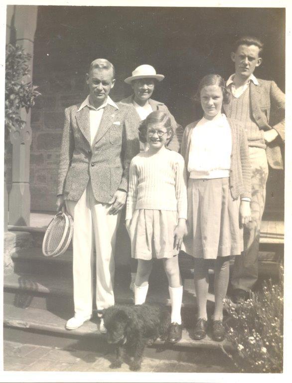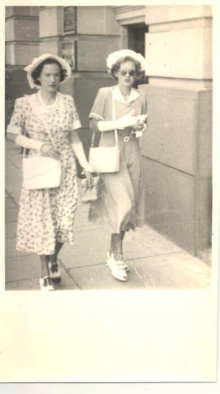 1936B/W prints: (a) Barbara Goode aged 3 as a flower girl at John and Phylis Sandover's wedding in 1936. She is dressed in a full length frock, has a large bow in her hair, and is sitting on a carved wooden seat and holding a bouquet. (b) Bride, Barbara Goode, in wedding dress, veil and long gloves, with bridegroom, Kenneth Barton, in uniform and her bridesmaid in satin frock with a fur over her arm. (c) The Goode family, L-R: Roger, Kathleen, Barbara, Elizabeth and Robert with their dog on the steps of their home. (d) Barbara Goode dressed for a school dance in 1950 in a satin frock, fur stole and her grandmother's bertha. (e) Elizabeth and Barbara Goode in light summer frocks, white hats, gloves, bags and shoes in 1950/1 in St George's Terrace, Perth.