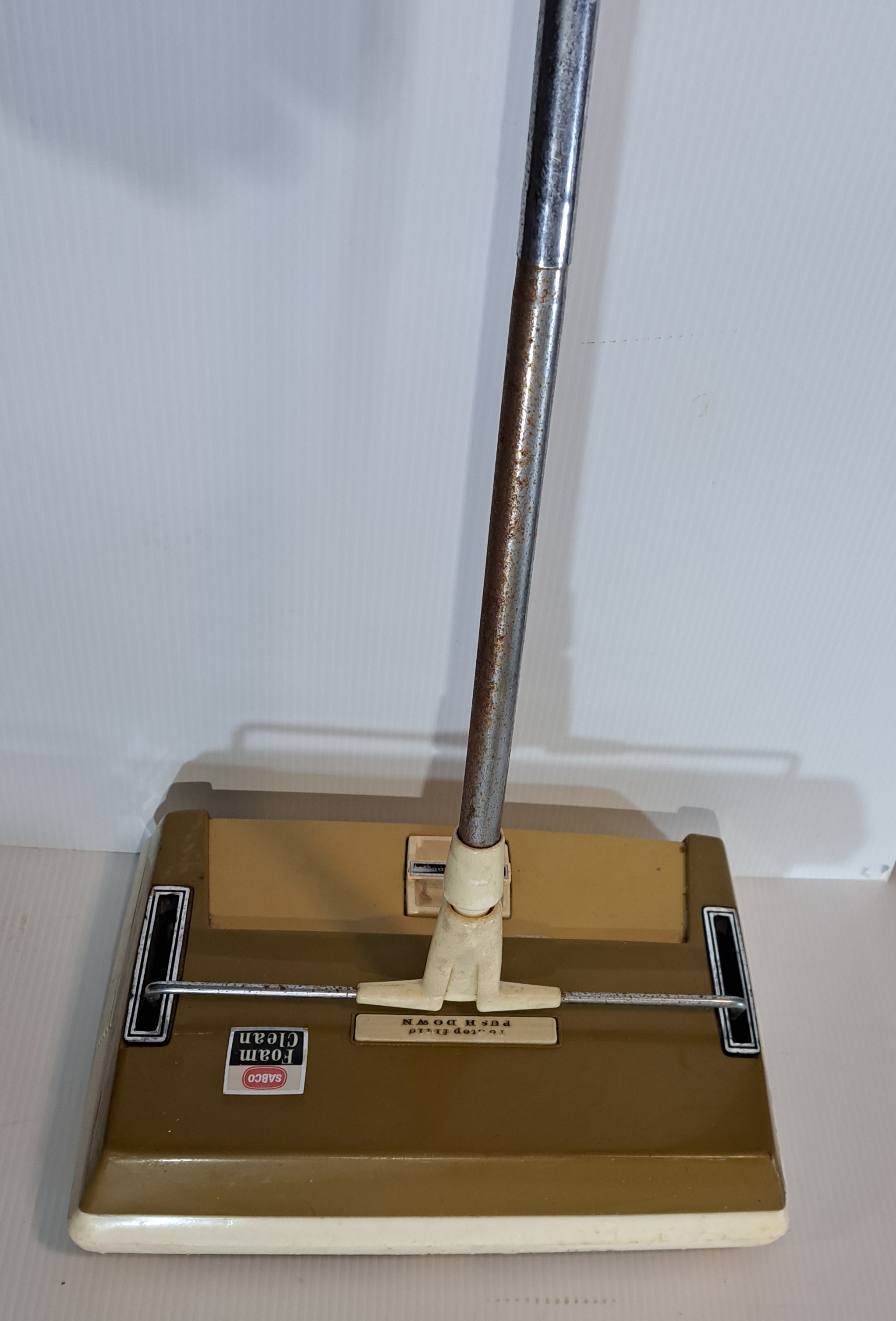 Sabco, originally the South Australian Brush Company, has a history spanning over 130 years, beginning in 1892 as a small hand-crafted broom and brush manufacturer It has evolved from early, simple floor scrubbing brushes and brooms into a modern provider of advanced, manual micro floor cleaning. founded in 1892-1900's by William Ellis Hay in Adelaide . This shampooer is filled with floor cleaner then puched by hand, it has roller brusher & foam underneath.
