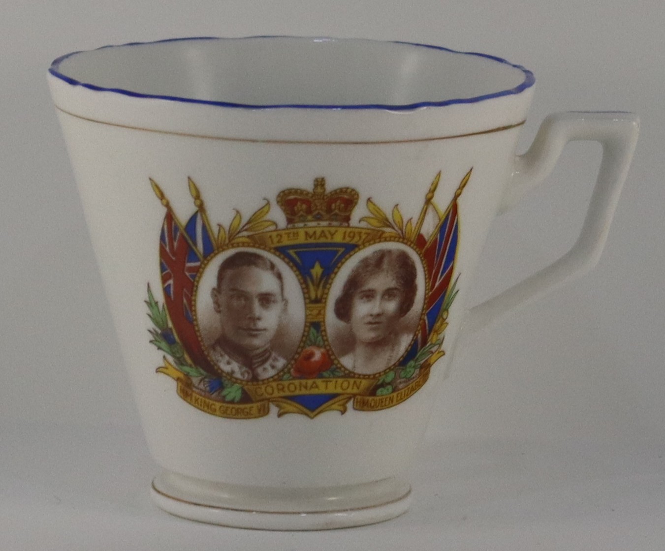 c. 1937A white cup with two oval pictures, one of King George V and the other Queen Elizabeth in sepia. On either side of the oval pictures are the flags of England in gold red and blue, and separating the two pictures is a gold and red crown, and underneath the crown is a gold ribbon scroll. Underneath the two pictures is a gold ribbon scroll. The cup has a blue rim and a gold trim approximately half a centimetre below the rim and around the base of the cup. There is also a blue trim down the handle. On the reverse side of the cup are blue leaves intertwined with a blue ribbon scroll.