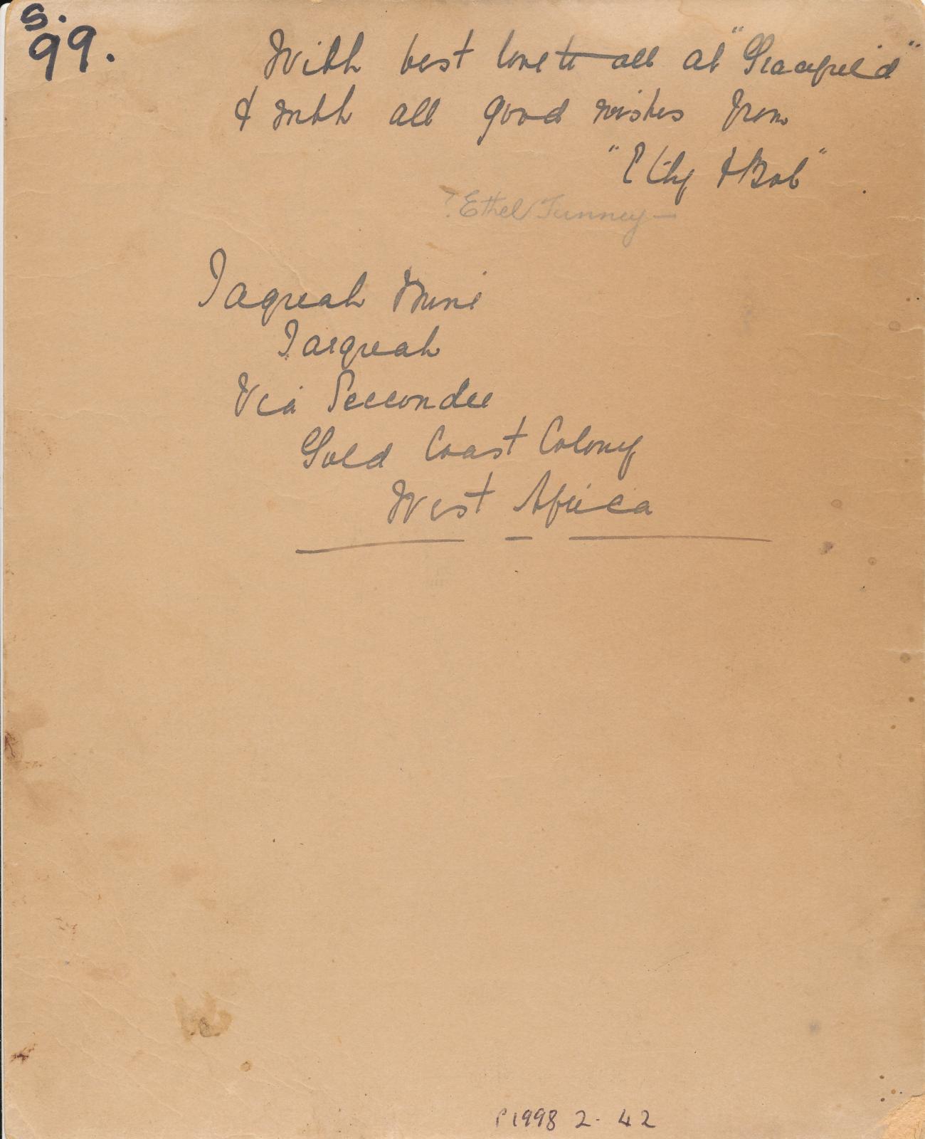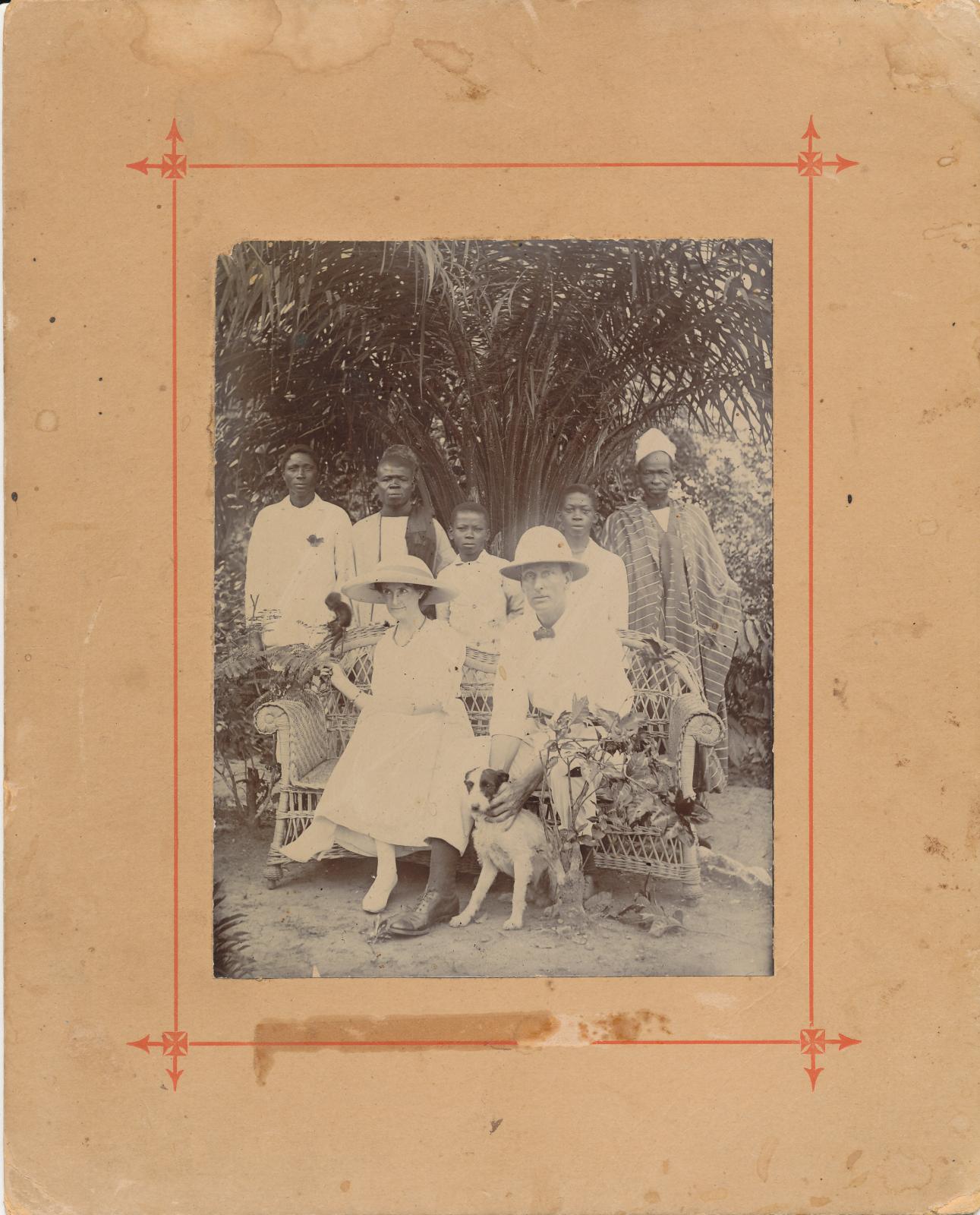 "Hatted for the Climate" Ethel Tunney and Husband (Bob) in West Africa Gold Colony Colonial days of British Empire. Note tropical hats, monkey, dog, African staff, cane seat and tropical plants