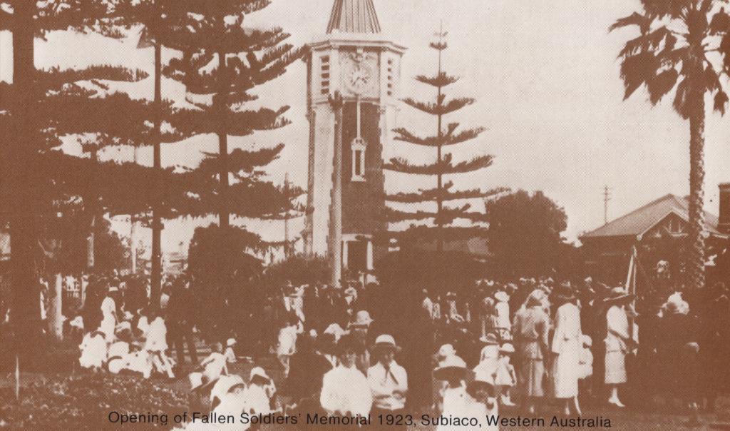 [d] Opening of Fallen Soldiers Memorial, 1923, Subiaco, Western Australia - Clock Tower Memorial with large group of people. Date of Use 1999.
