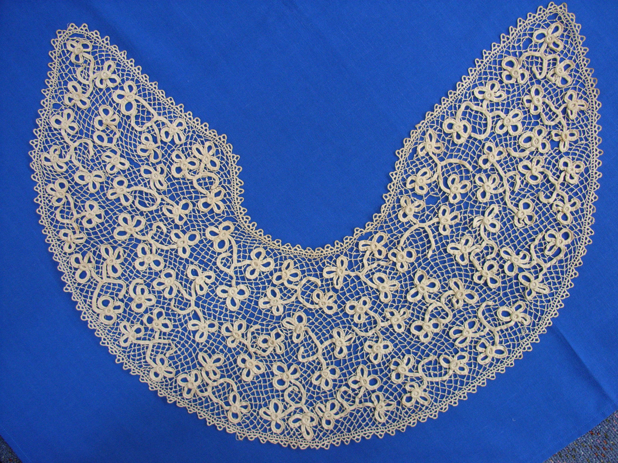 Design consists of a variety of flower and leaf motifs of varying sizes connected with picot brides.