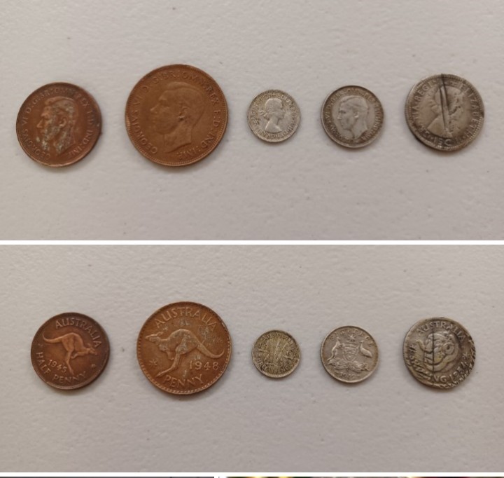 Item B: "Australia. Penny. 1948" (reverse) "GEORGIVS VI D:G:BR:OMN:REX F:D:IND:IMP." (obverse)
