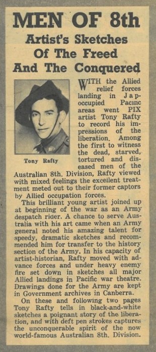 Cover article on war artist NX111341 Sergeant Anthony (Tony) Rafty leading series of sketches relating to recently released prisoners of war which appeared in "The Mirror", Sydney on 20 October 1945
