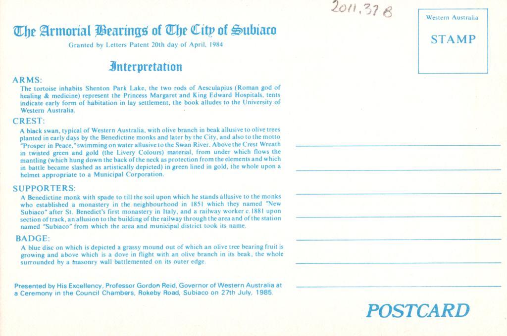 2010a,b+c) Three identical City of Subiaco postcards featuring the Armorial Bearings of the City on the front in colour of a monk with a spade on one side and a railway worker with a sledgehammer on the other, each with a hand on a shield divided into three by two wavy lines. The top third features two tents with a book between, the middle third has two staffs with a snake twined around with a long necked tortoise between, the the lower third has a tent. The shield is crowned by a swimming swan hoding an olive branch, above a helmet with green and gold mantling. Beneath this is a badge with white dove with olive branch flying above an olive tree all surrounded by masonry blocks. The reverse has a full interpretation of the Armorial Bearings on the left hand side. The right hand side has lines for an address, a rectangle in the top right hand side has 'Western Australia' and 'STAMP' printed in it. The bottom right hand side has 'POSTCARD'.