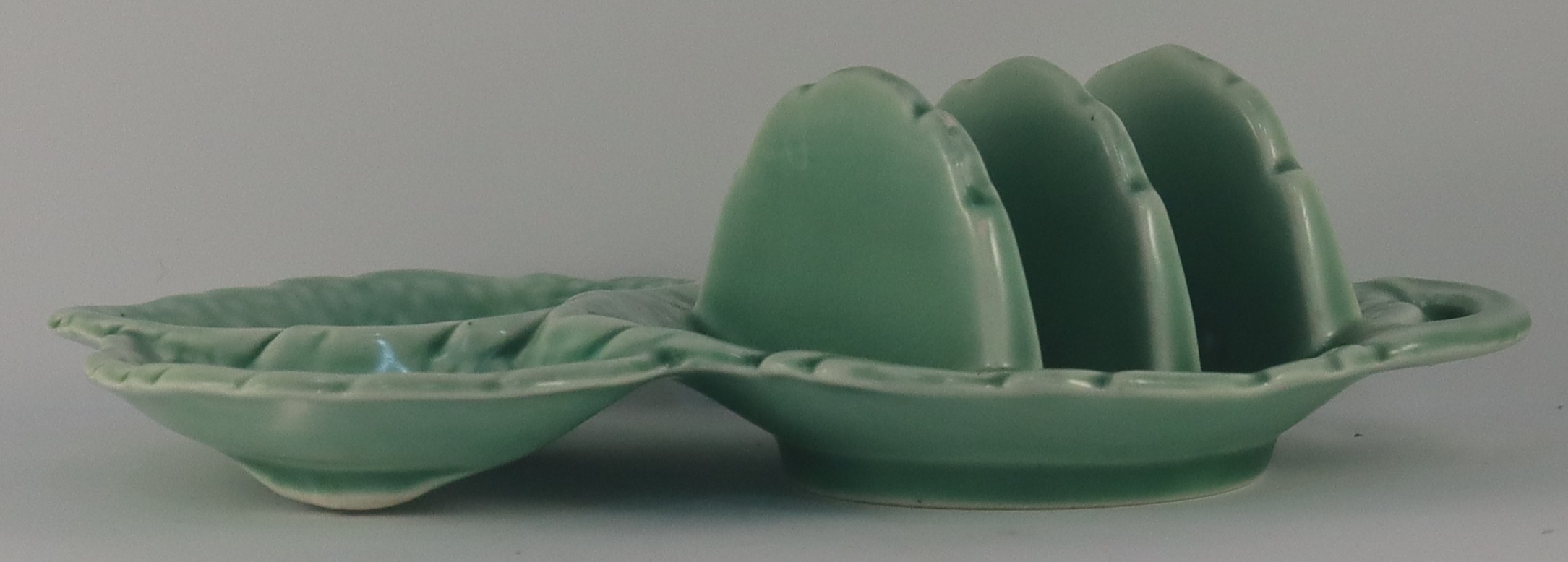 A green ceramic toast rack in leaf design with space for butter and jam.