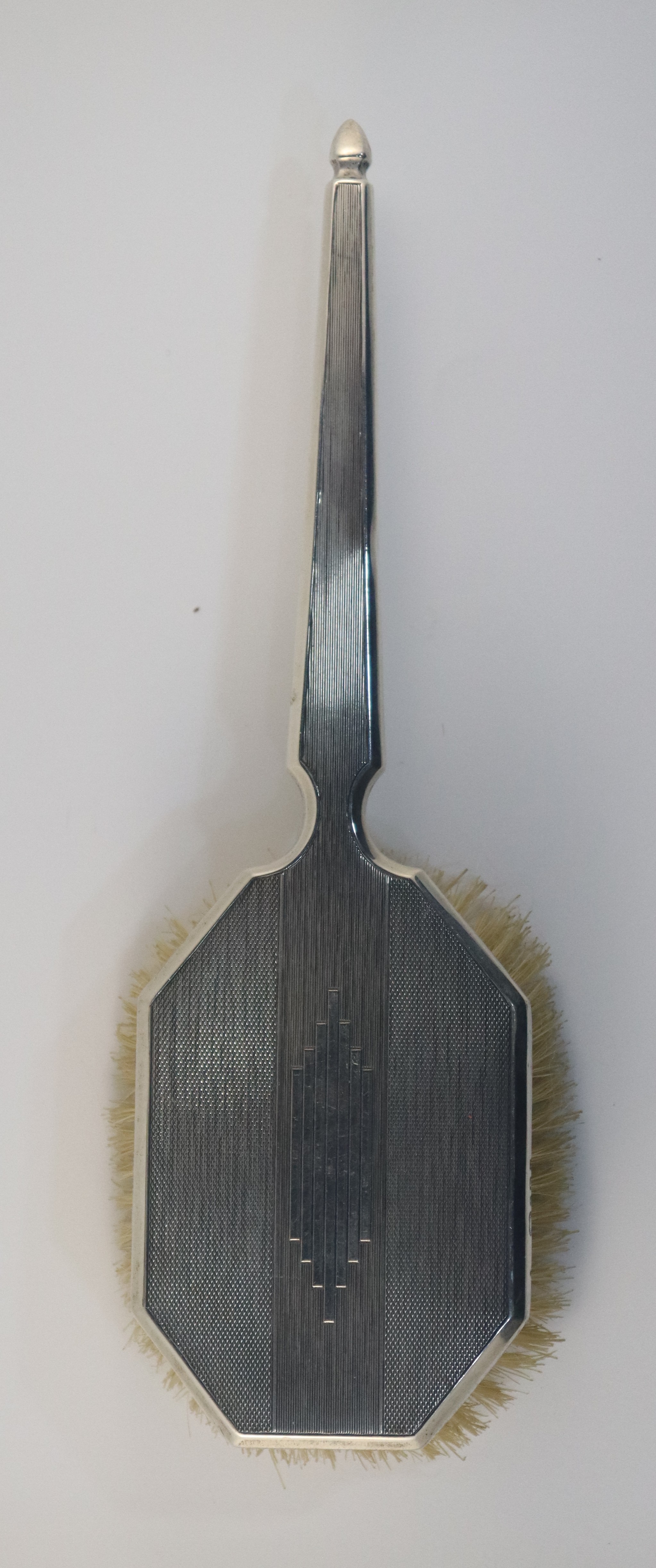 c. 1931A seven sided sterling silver hair brush. The top of the hair brush has a central pattern surrounded on either side with a fine honey comb pattern. The central pattern has a fine vertical line background with with seven solid and transparent vertical lines that are approximately two millimetres wide.