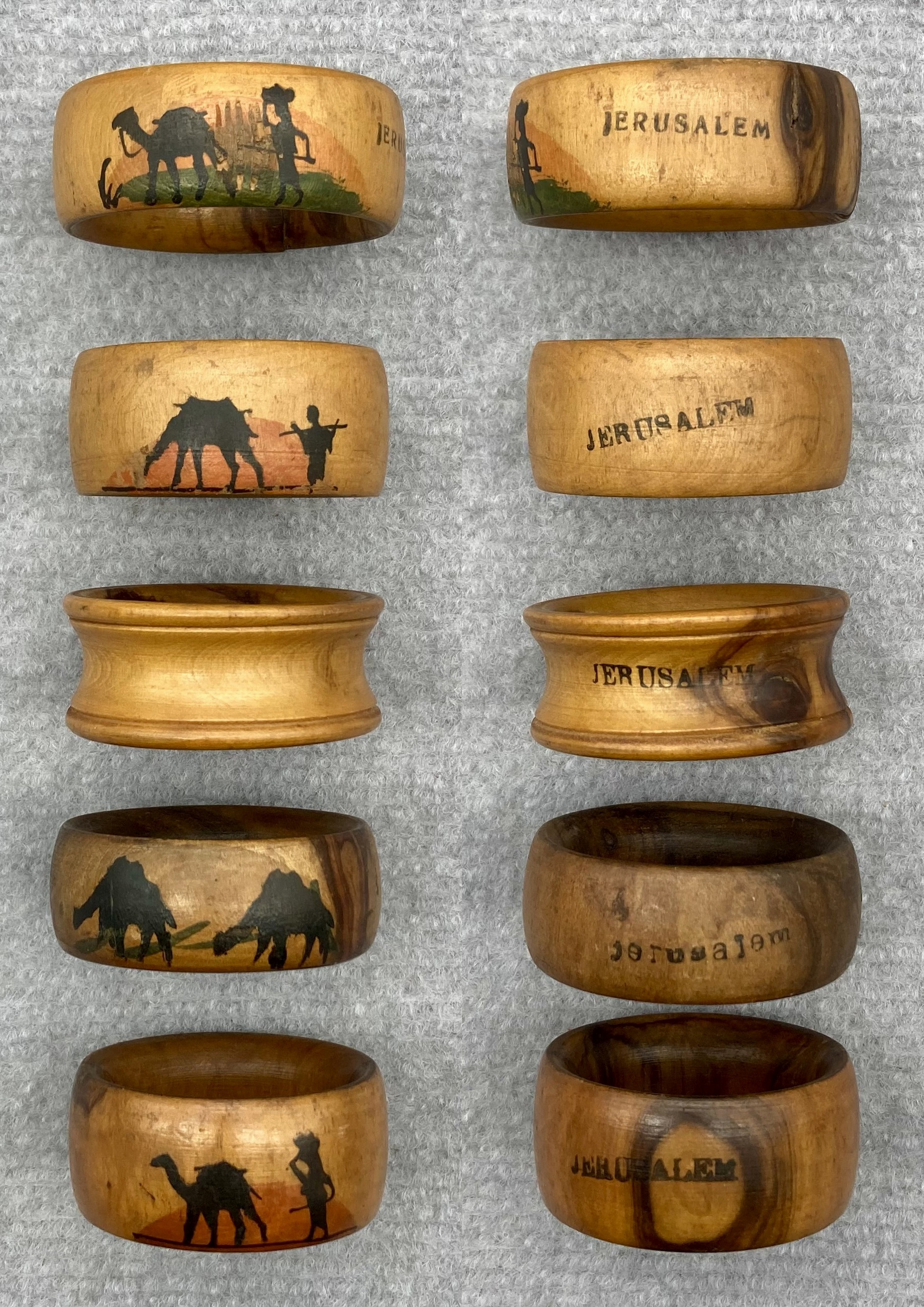 Each is slightly different in height and width, but all feature the word 'Jerusalem' printed in black paint on the edge, and four of the five have depictions of camels and their handlers, often carrying water, with the sunset or sunrise behind.