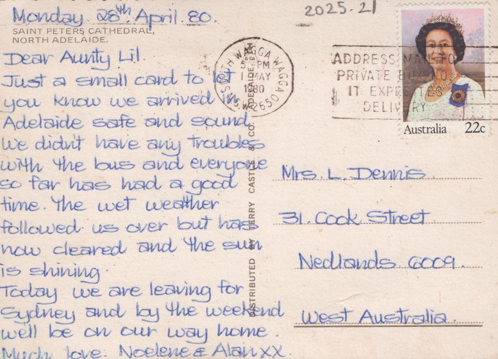The reverse has a hand written message in blue pen addressed to 'Mrs L Dennis / 31 Cook Street / Nedlands 6009 / West Australia'. The message is dated 'Londay 28th April 80' from 'Noelene and Alan' about their travels in Adelaide and addressed to 'Dear Aunty Lil'. There is a colour stamp of Queen Elizabeth II with 'Australia 22c' below.