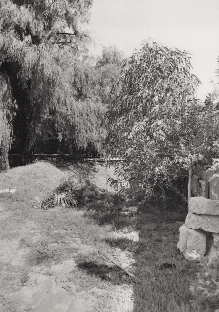 1985Black and white photograph of an outdoor space in Subiaco. There is a grass patch with some stones to the right. There are some large trees in the image.