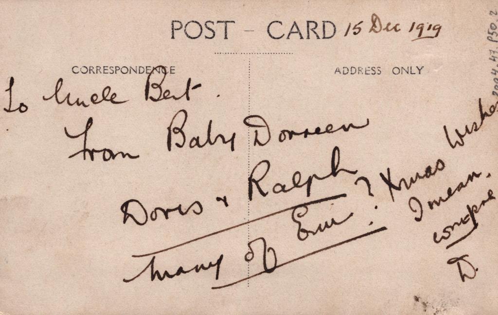 Reverse: Written in black pen 'To ..? Bert From Baby Dorreen(?)' and 'Dores & Ralph'. More text is seen as well.