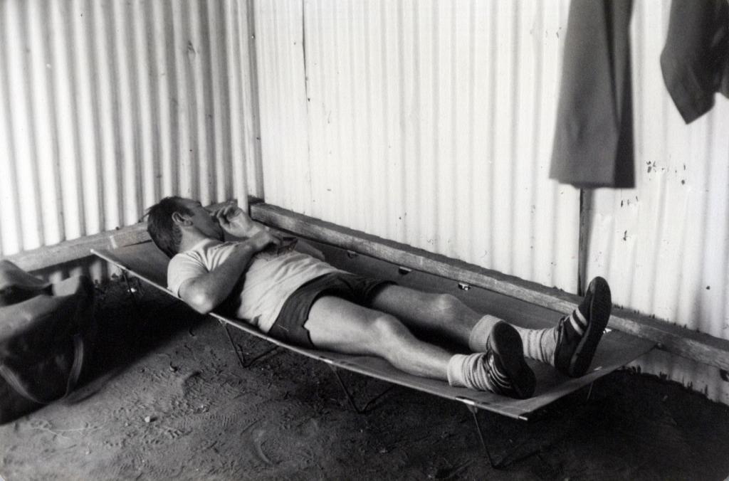 A black and white photograph of a male in a T-shirt and shorts laying down on a camp bed that is slightly raised above a dirt floor. The bed is adjacent to two corrugated iron walls that have two items hanging on the right side of the photograph.