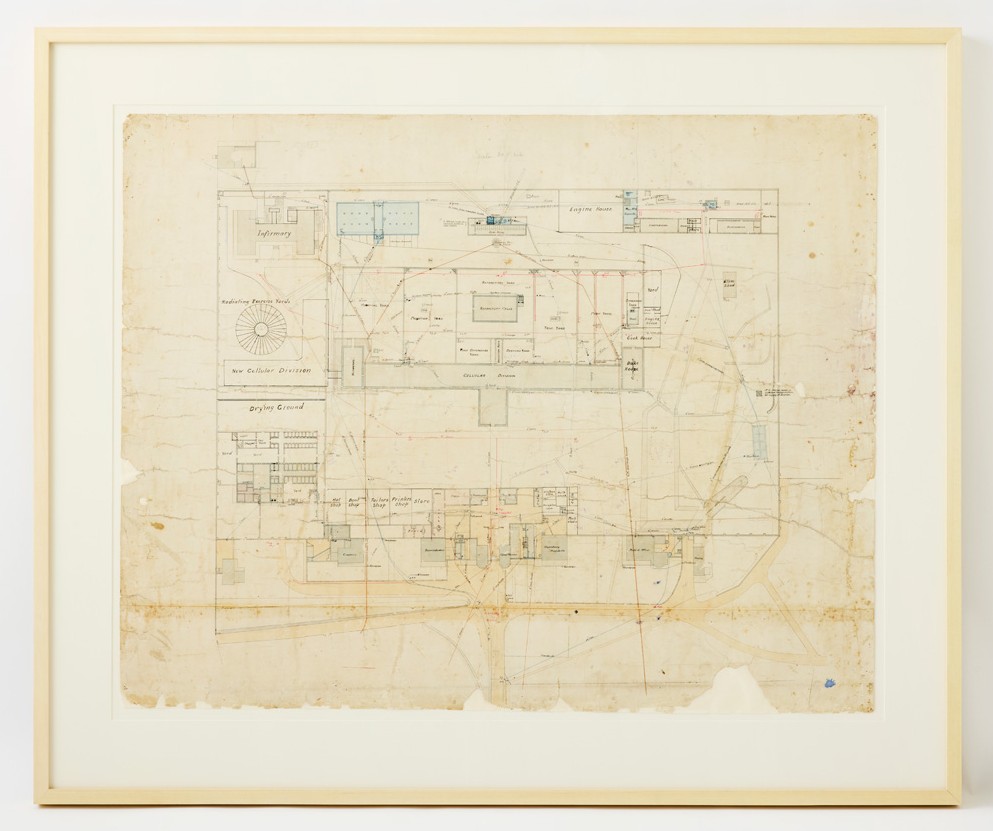 The first layer of this site plan is a copy of a plan 'measured and drawn' by a prisoner in 1897. Sections of the site have been subsequently added to the plan, to show all the buildings added to the site between 1897 and 1909. This plan was possibly created in an attempt to update the Prison’s visual records, after the sweeping architectural changes that followed the 1898 Royal Commission, and the 1903 Prisons Act. The accuracy of the original map meant that new buildings simply had to be remeasured and added to the plan where appropriate. The obvious handmade alteration to this particular plan means it was likely a draft, or a first attempt by hand, to build upon the pre-existing plan, from which a final, official version was then copied. The plan’s second layer was likely made in c1907-1908. These additions include the West Workshops (built 1900-1901), the new wing of Women's Division and New Division (built between 1904 and 1907), including the radial exercise yard, which was demolished within ten years of its construction.