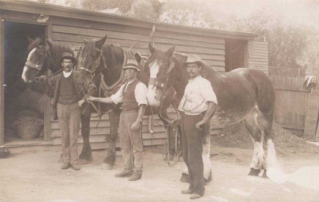 POSTCARD: THREE MEN WITH HORSES, FROM ALBUM 1, THELMA GREEN COLLECTION