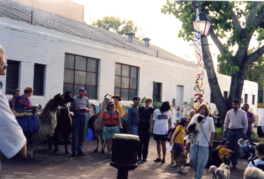 1996Coloured image of unknown people in Subiaco. The image shows a group of people and animals. There are three lama's and a number of dogs. There is a white industrial brick building with a mural painted on it in the background. There is a large tree on the left and a painted banner suspended from the tree. There is a street lamp and a litter bin in the foreground.